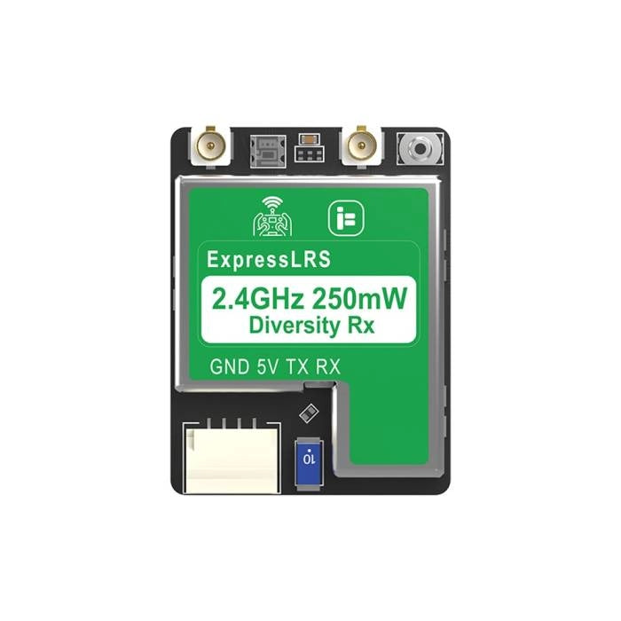 The iFlight ELRS True Diversity 2.4GHz Receiver + 2x70mm Antenna is a true dual-antenna diversity receiver with exceptional frequency stability. The ELRS diversity receiver features well-placed dual antennas with shielding covers, enhancing its resistance to interference, widening signal reception, and ensuring a more stable connection compared to conventional single-antenna receiver systems. It incorporates a TCXO temperature-compensated crystal oscillator to prevent frequency shifts caused by temperature variations. It sufficiently meets the reliability requirements for long-distance flights, aerial photography, or FPV freestyle maneuvers.