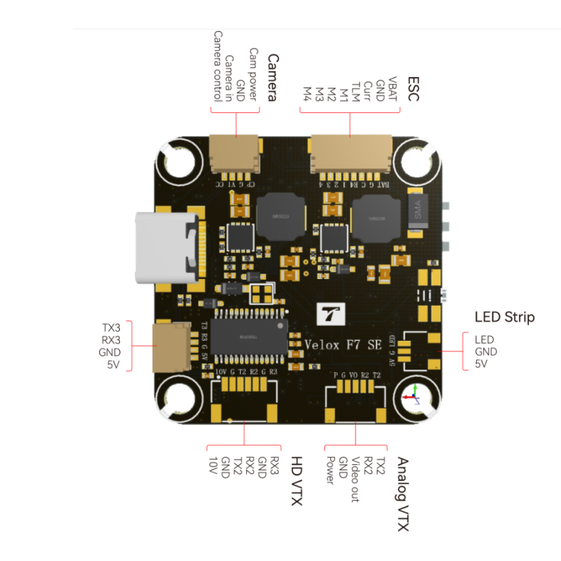 The Velox F7 SE FC is a full-featured flight controller suitable for FPV beginners. It uses Betaflight's latest wiring standard, making your flight safer and more reliable.
